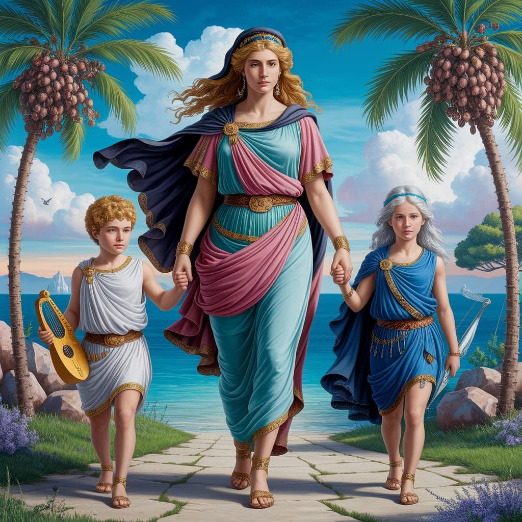 This image shows a serene scene of Greek goddess Leto walking with her children, Apollo and Artemis, through a lush island path lined with date trees, evoking a sense of ancient Greek culture and mythology in a warm, hyperdetailed oil painting style.