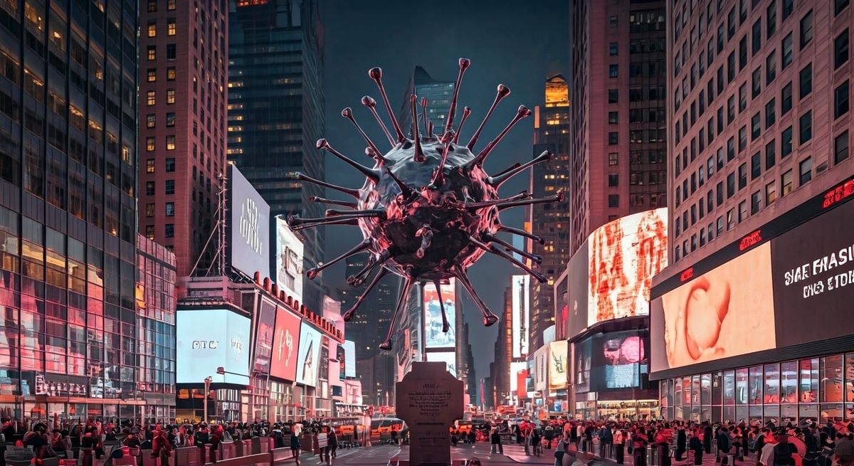 This stunning image depicts a colossal, hyper-realistic metal sculpture of a virus soaring above the streets of Times Square, its surface reflecting the vibrant lights of the area, as a crowd of onlookers gazes up in awe at the massive artwork.