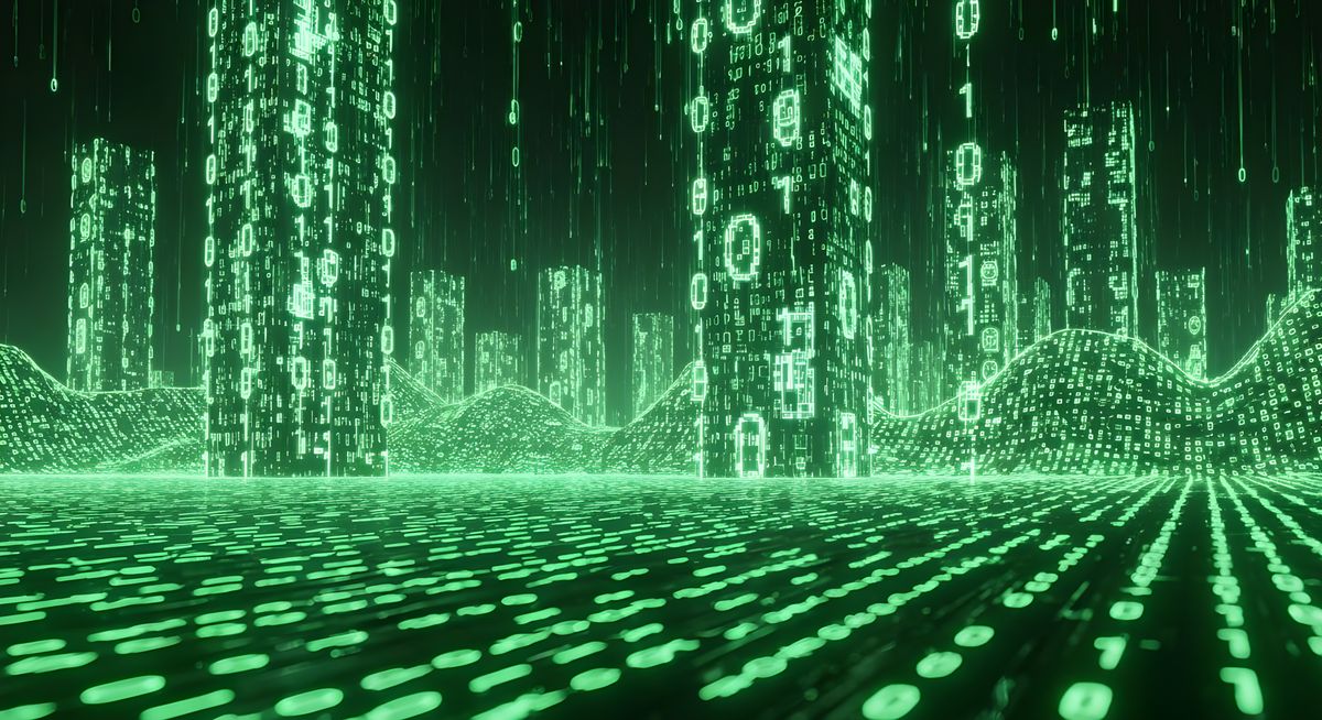 This image depicts a stunning digital world constructed from scrolling green binary code and shimmering holographic symbols. Towering structures rise within an atmosphere of streaming energy, rendered with cinematic detail.
