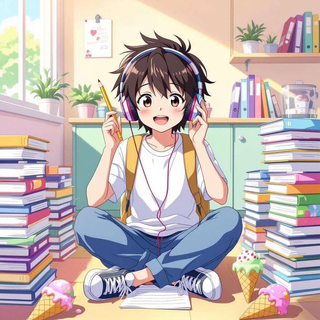 This image shows a cheerful Taiwanese child with headphones, holding a pencil amidst colorful homework and ice cream cones. The artwork blends anime, manga, and Pixiv styles in pastel colors.