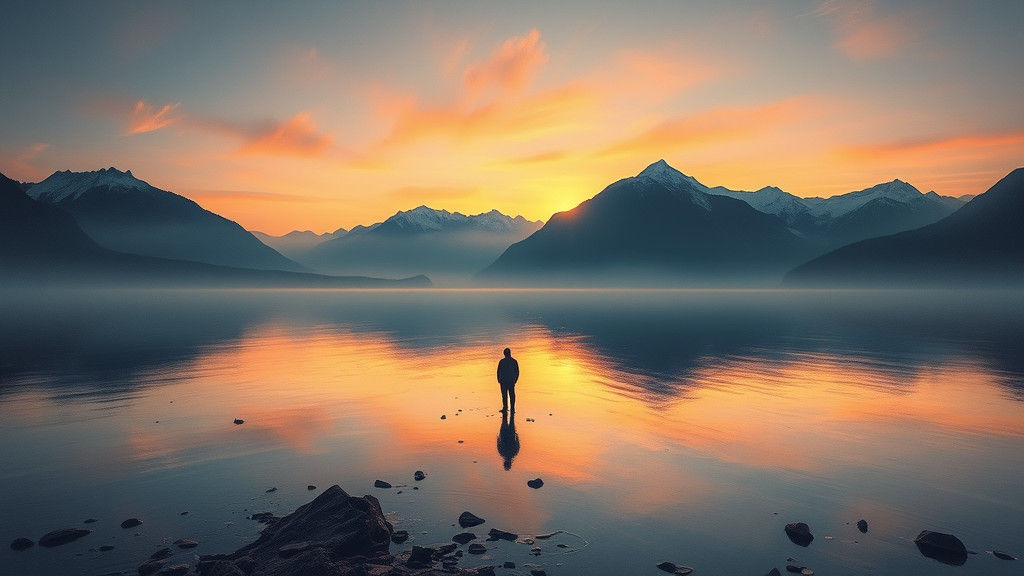 A hyperrealistic color charcoal drawing of a serene mountain lake at dawn with a lone figure. This image captures the sublime beauty of nature in a dreamy, ethereal and atmospheric style.