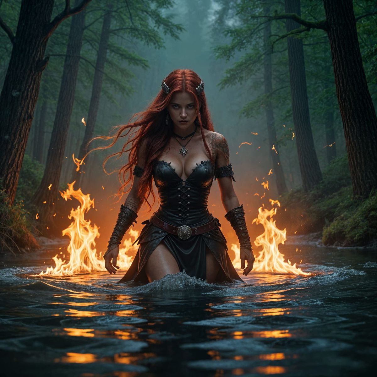 A powerful image of a Viking woman with long red hair emerging from a lake in a dark forest, surrounded by flames, symbolizing rebirth.