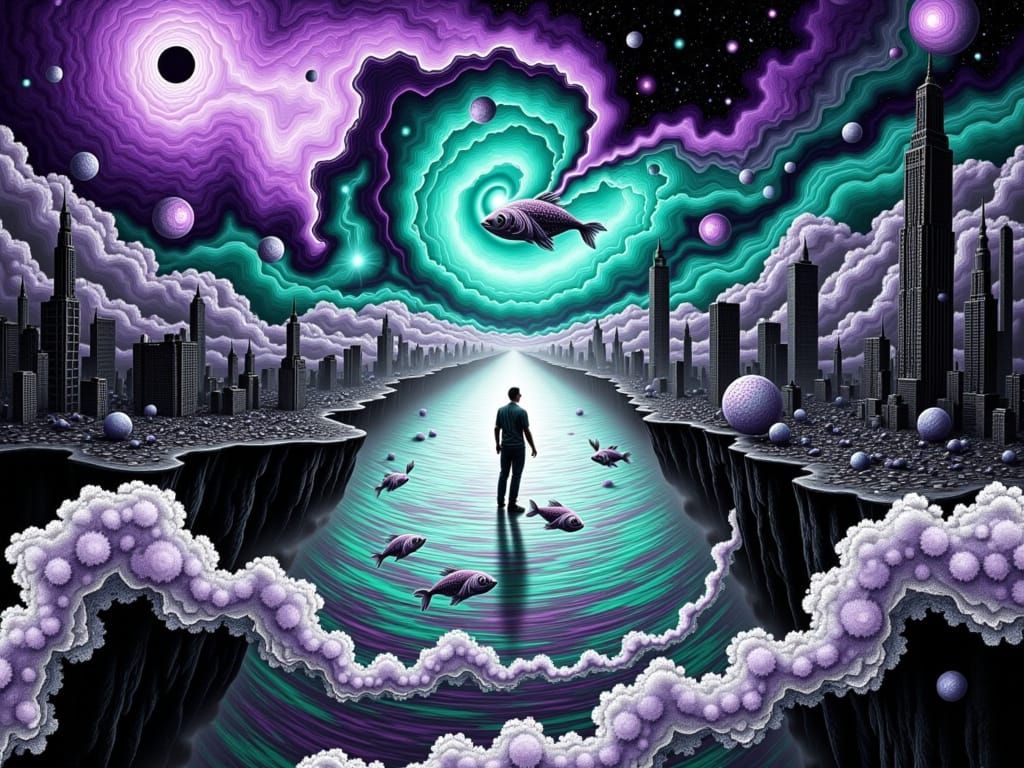 Black and White with selective purple and teal color. A man standing on a precipice, facing a psychedelic landscape of energy waves, crumbling city skyline and floating fish. Surreal fantasy, bizarre. In the style of <lora:Black And White 3:0.6>, <lora:TriXy3:0.7>, <lora:Phantasmagoric:0.7>