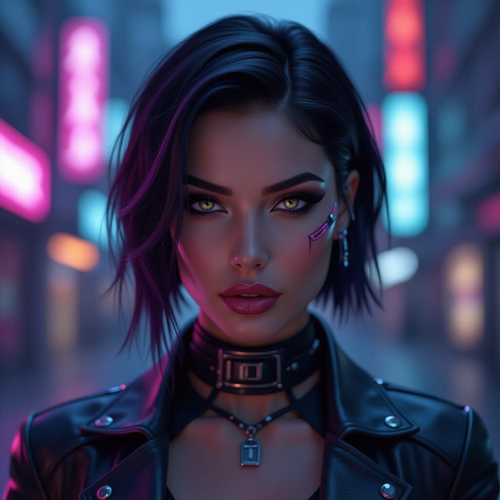 This ultra-realistic image features a captivating cyberpunk femme fatale with intense eyes and short neon hair. She wears futuristic leather and metal, set against a blurred city backdrop with dramatic lighting.