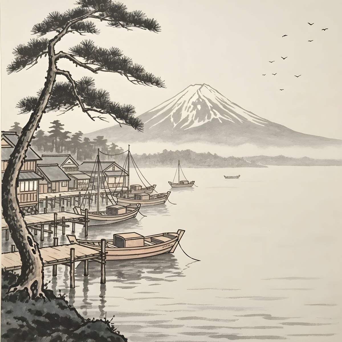 This image showcases a tranquil Japanese fishing village harbor in the traditional sumi-e ink painting style. Featuring wooden boats, Mount Fuji, and pine trees, it uses masterful brushstrokes and ink washes to capture a serene atmosphere.