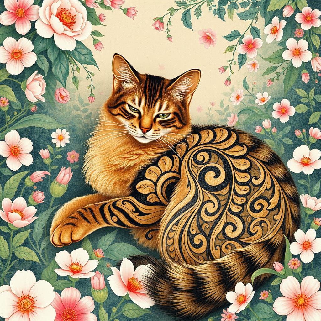 This image depicts a serene cat amidst a lush, vibrant Floralcore landscape with intricate, swirling fur patterns and pastel-hued blooms, evoking the dreamy essence of Naturecore and the romanticized beauty of a bygone era, with a captivating blend of Art Deco's geometric sophistication and watercolor-li...