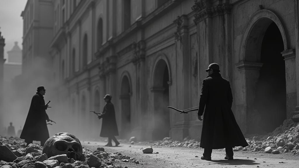 Easily generate your own black and white Italian film-inspired vampire hunter scenes with our free AI image generator