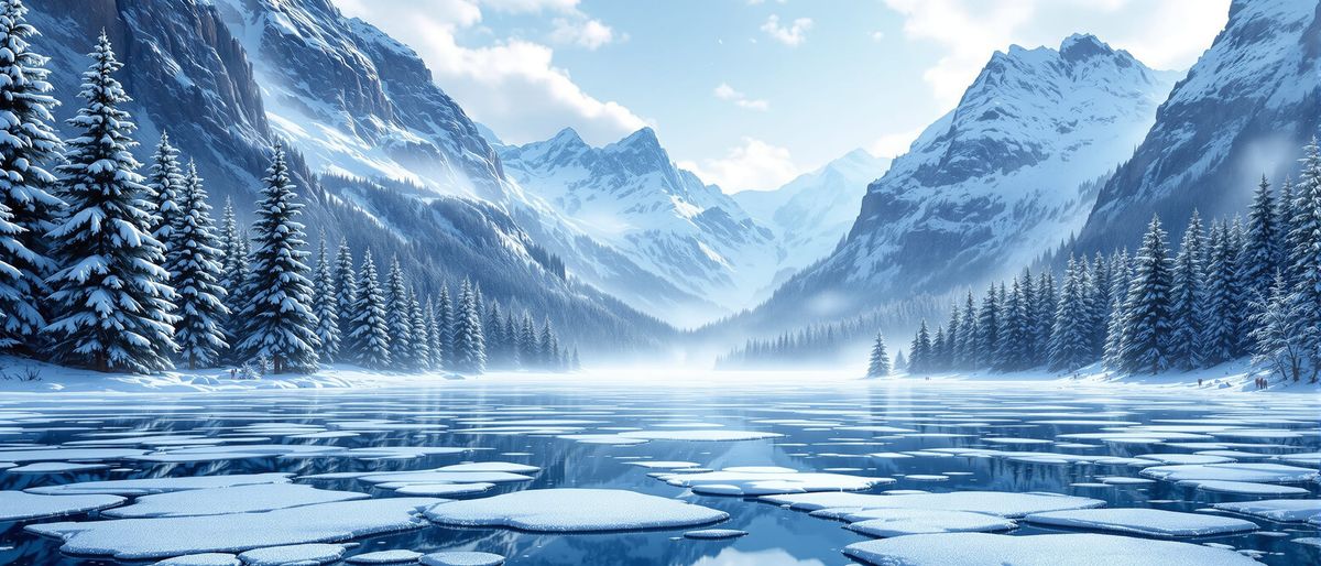 This image showcases hyperrealistic 4K photography of the Swiss Alps, featuring a frozen lake, snow-capped trees, and majestic mountains under cinematic lighting. It evokes an ultra-realistic, crisp view with subtle dynamic lighting and a cool color palette.