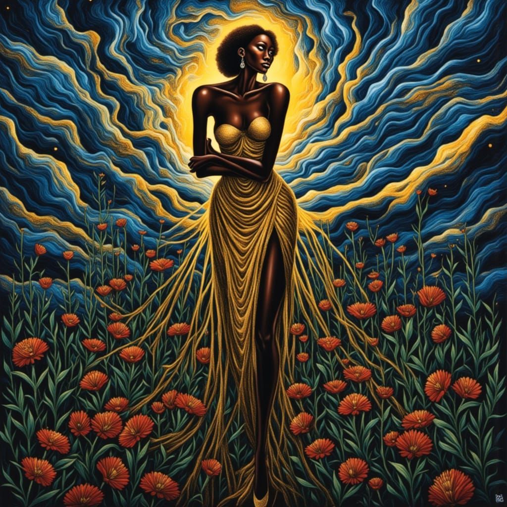 A striking picture of a Black woman with ethereal skin in a surreal dreamscape. The image blends art nouveau elements with impasto textures, featuring metallic motifs and turbulent skies in dark, opulent tones.