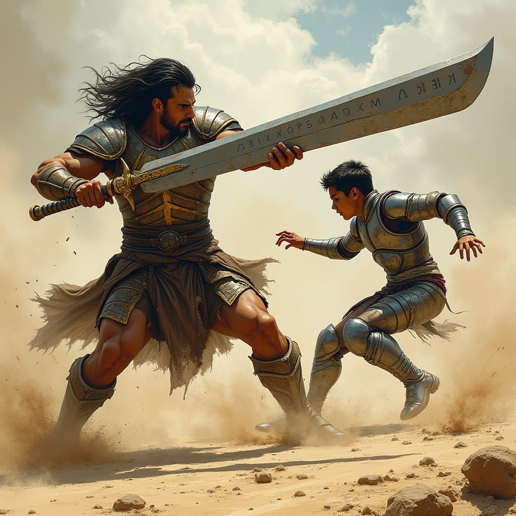 A dynamic image of a muscular warrior in worn armor swinging a massive buster sword, as his agile opponent dodges in sleek futuristic armor, amidst a cloud of dust and debris in a sunlit sandy arena, with intense motion blur and kinetic energy reminiscent of classic concept art and comic book illustratio...