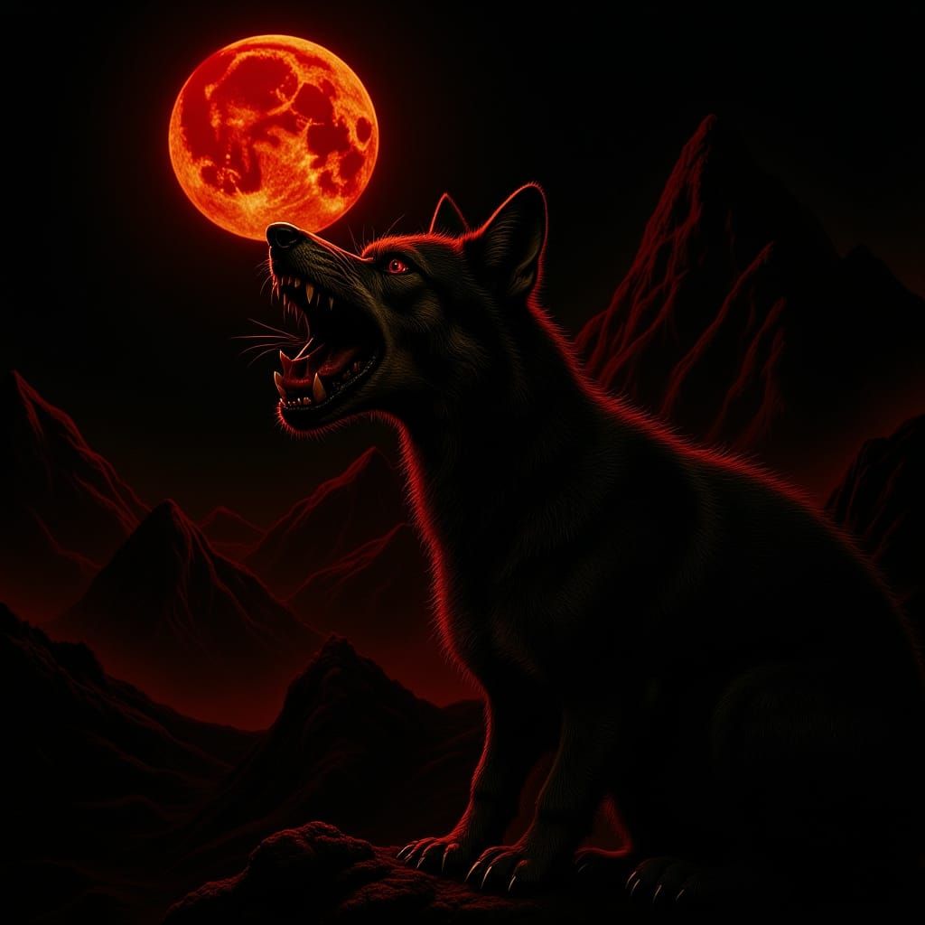 A dramatic image of a lone wolf howling at a blood moon on a mountain. Twisted trees and jagged rocks surround the wolf in this gritty, cinematic scene with bold colors in a dark realism style.