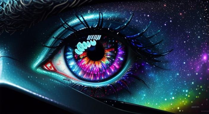 This image shows a close-up portrait of an alien with intricate, iridescent skin and glowing eyes, set against a colorful, swirling galaxy background. Rendered in a vivid alcohol ink splash art style with deep saturation.