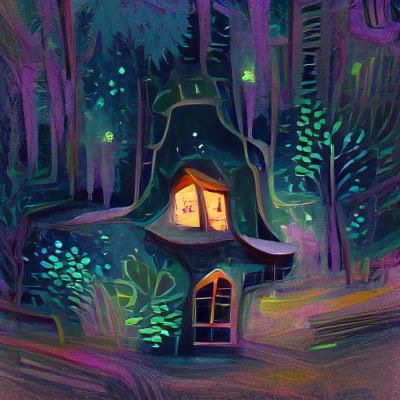 This image shows a charming cottage nestled in an enchanted forest under the night sky. Soft lighting and magical elements enhance the whimsical atmosphere.
