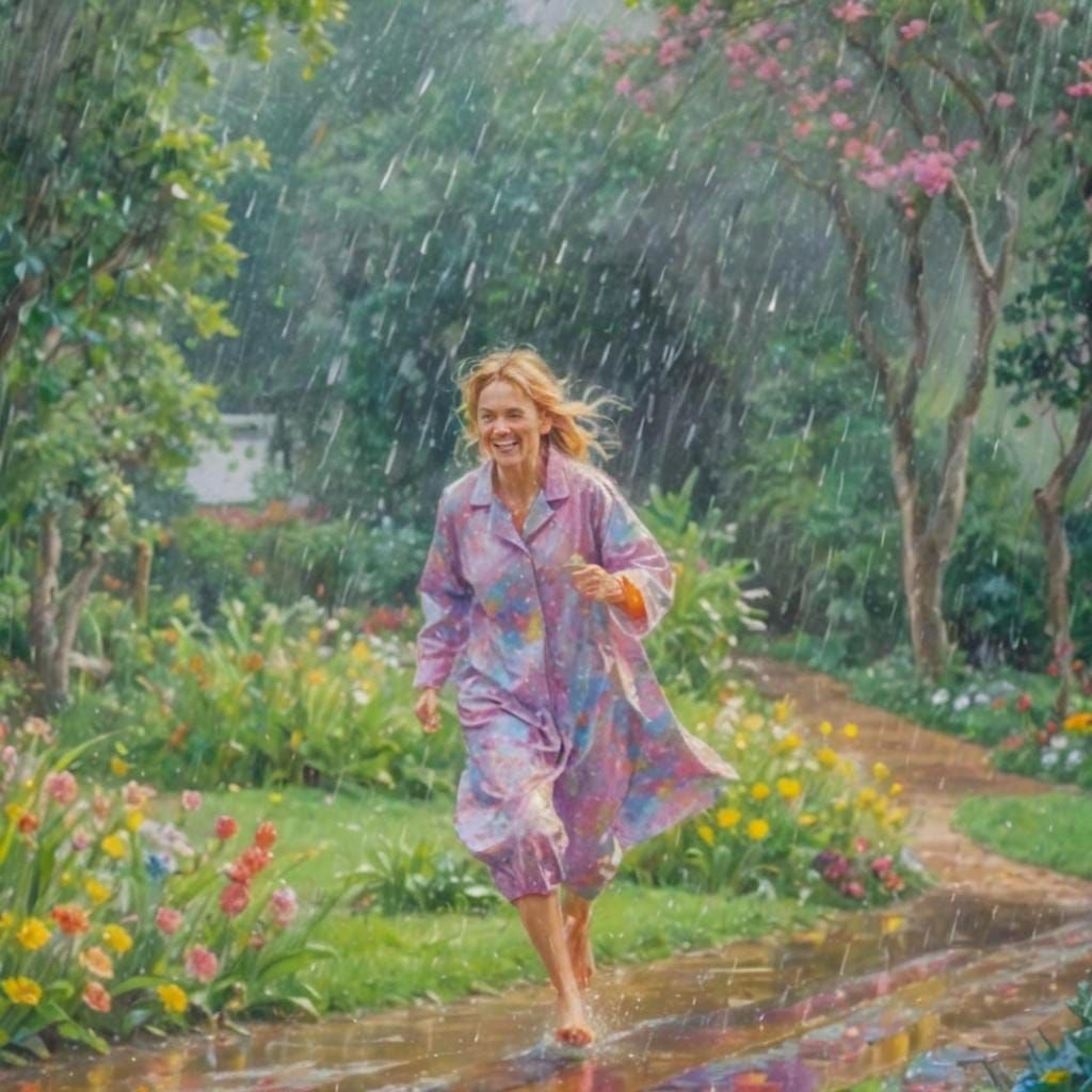A vibrant image of a joyful person in pajamas cheerfully running in the rain. The artwork is rendered in brilliant, psychedelic colors evoking happiness and freedom.