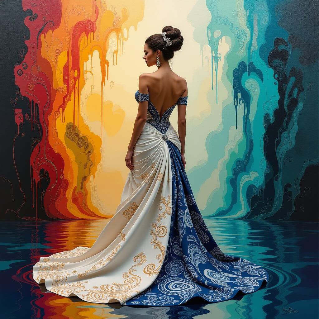 A surreal image of an elegant woman with zentangle patterns, set in a dreamlike world with melting oil on canvas. Evokes a surrealist aesthetic with fantastical elements, deep colors, and detailed matte painting.