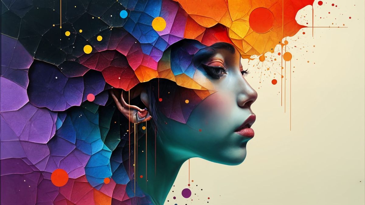 This stunning digital art piece depicts a woman surrounded by vibrant colors, reminiscent of the arc en ciel style with a touch of surrealism