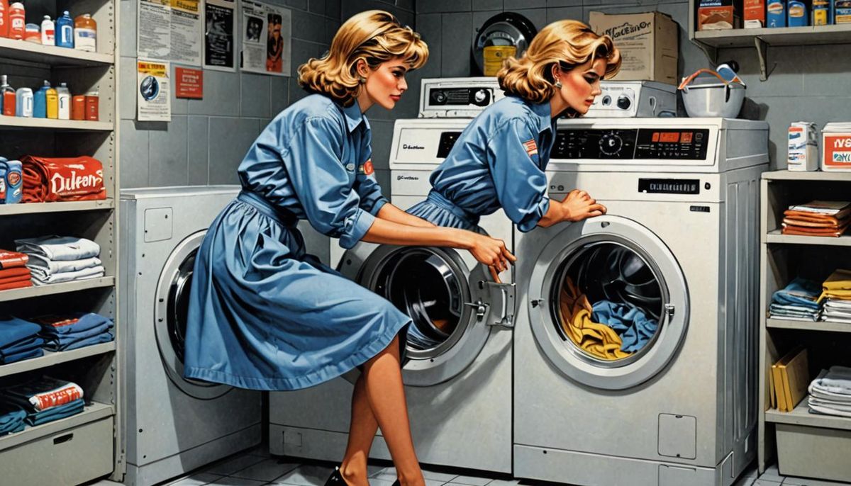 This image shows a retro 1980s-style advertisement with a fashion model showcasing a giant whirlpool inside a washing machine in a comic book art style.