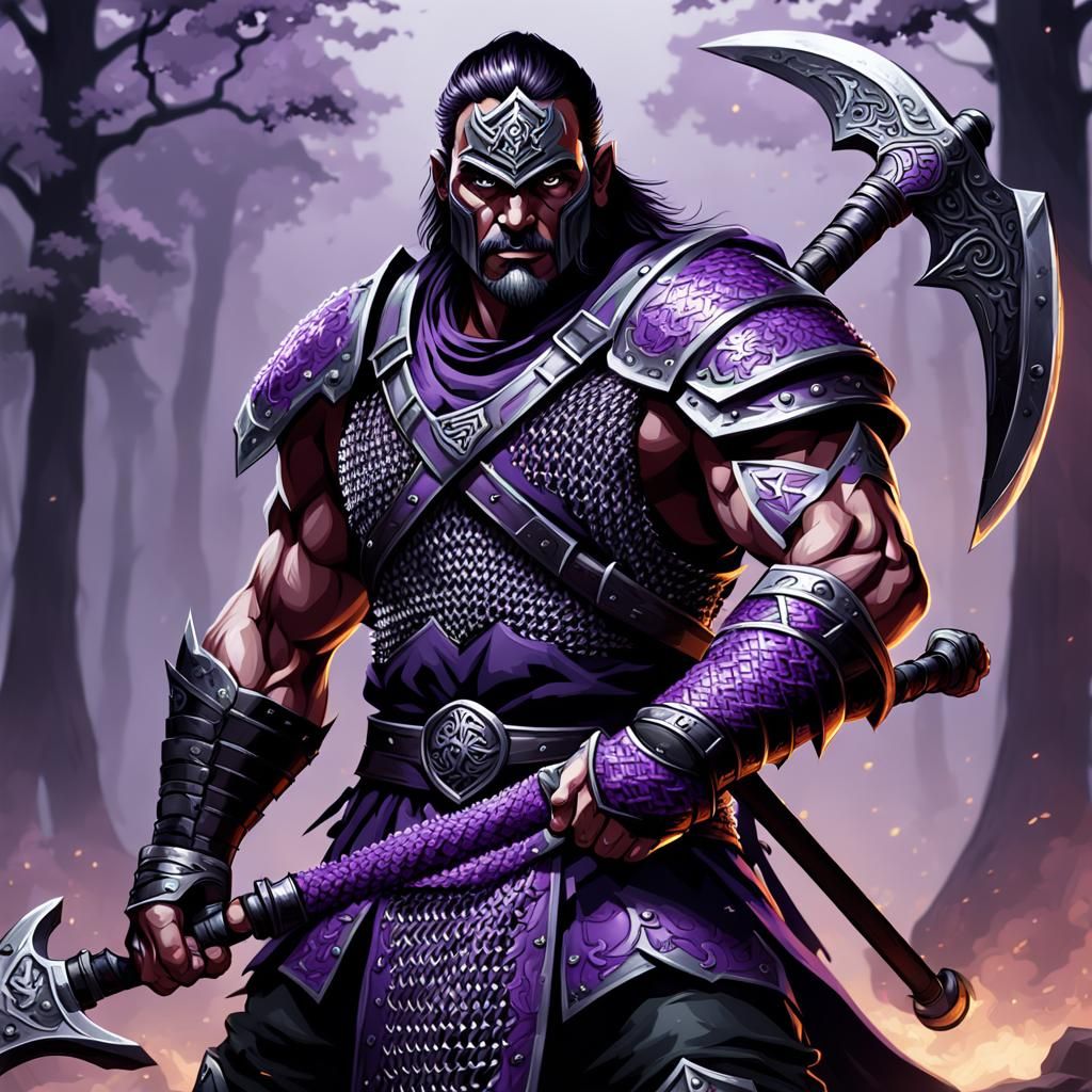 This image shows a muscular warrior clad in purple and black chainmail, wielding a two-handed battle axe. The artwork is rendered in a Pathfinder style.