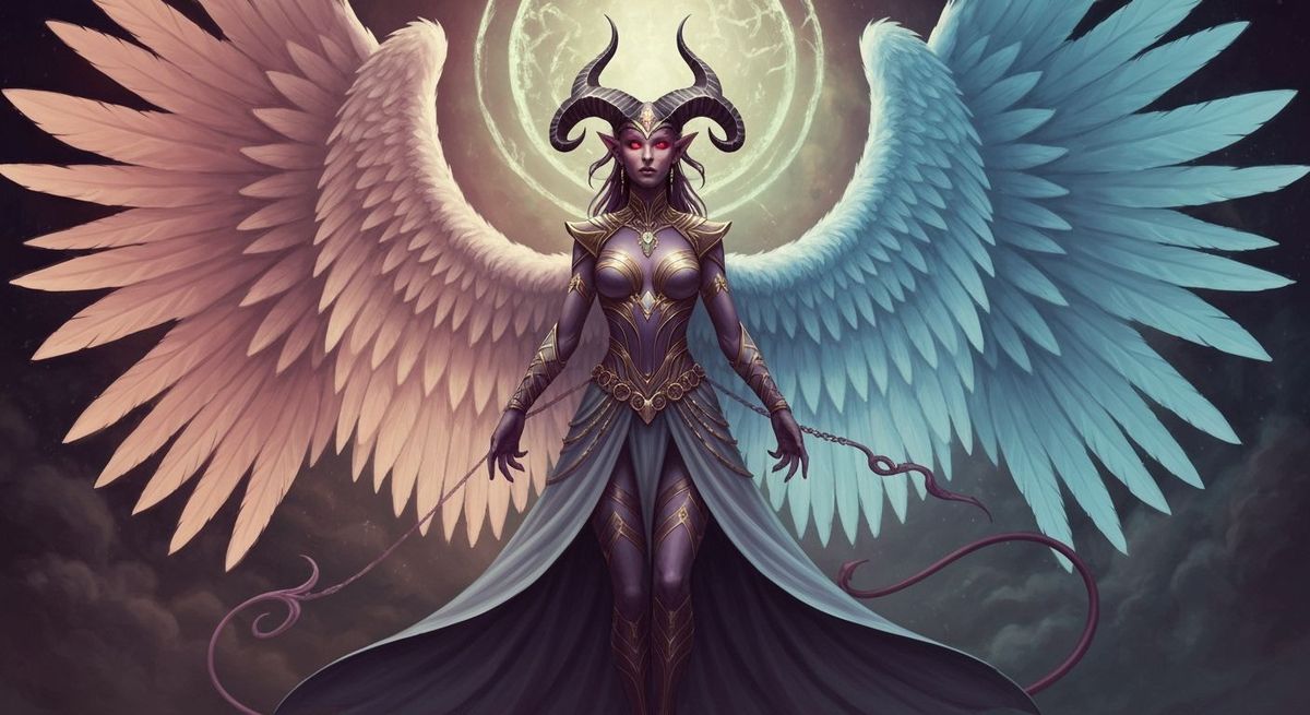 This image features a majestic figure with wings, blending angelic and demonic characteristics. The scene is set against a dynamic, mystical backdrop with vibrant colors and intricate details.