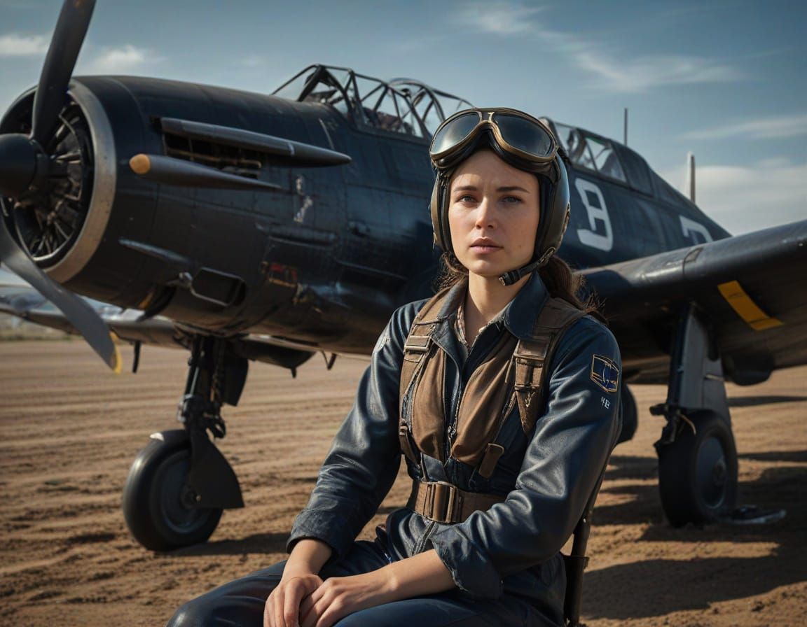 This image shows a pilot sitting next to her Corsair. The woman's face is stained with sweat and oil, illuminated with dramatic lighting and high contrast shadows. The image is reminiscent of gritty oil painting.