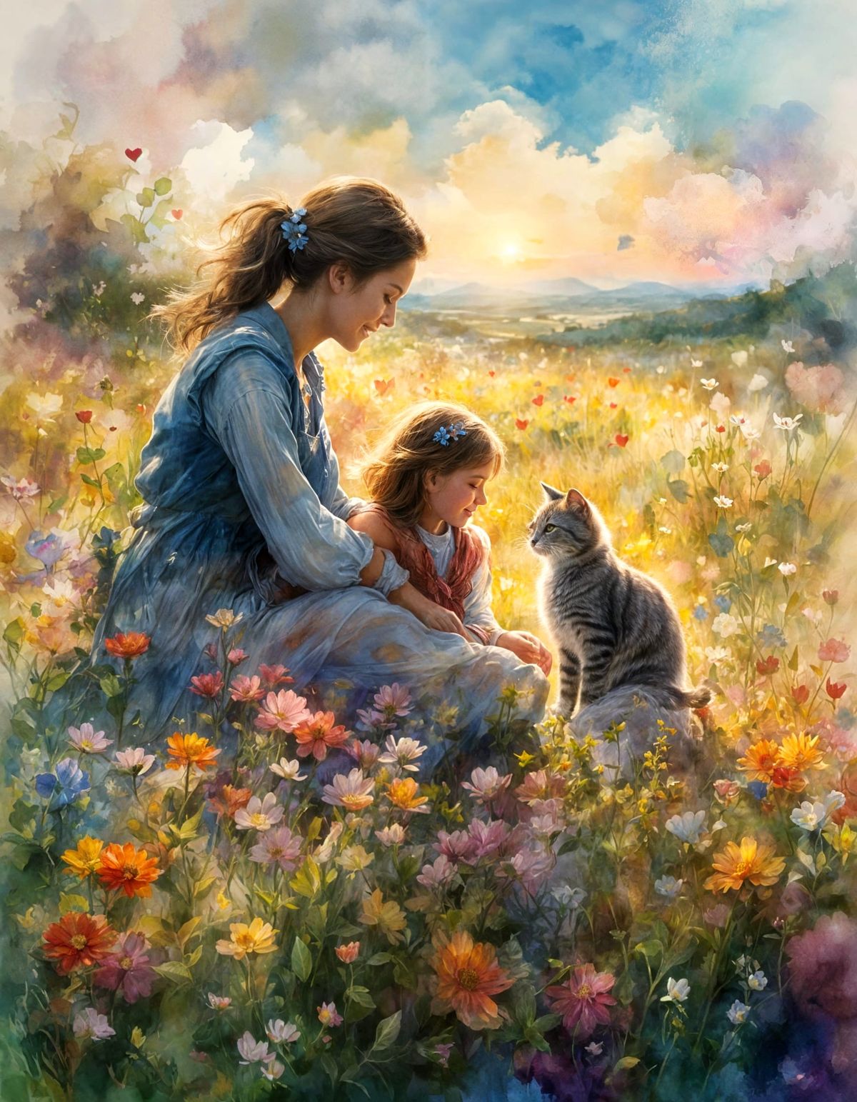 A heartwarming watercolor scene of a mother and daughter surrounded by a lush meadow, colorful flowers, and a sunny sky, captured with fine art detail and dramatic light.