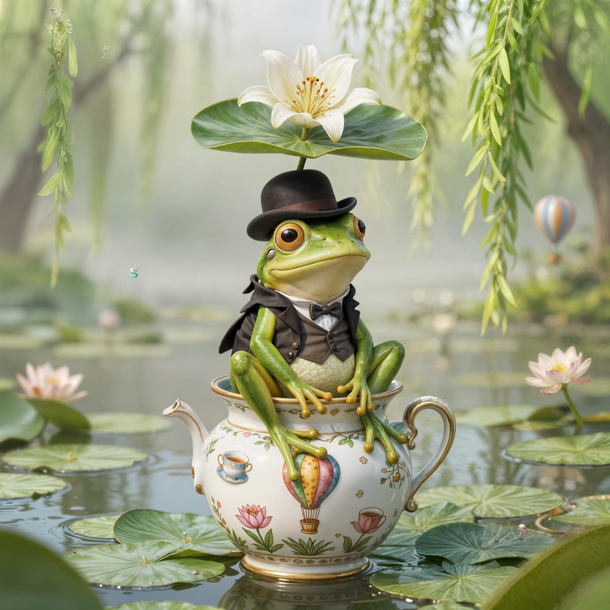 This image shows a whimsical anthropomorphic frog wearing a bowler hat and waistcoat, balancing a lily pad in a decorated porcelain vase. Features a misty morning lily pond scene, in a children's book illustration style.