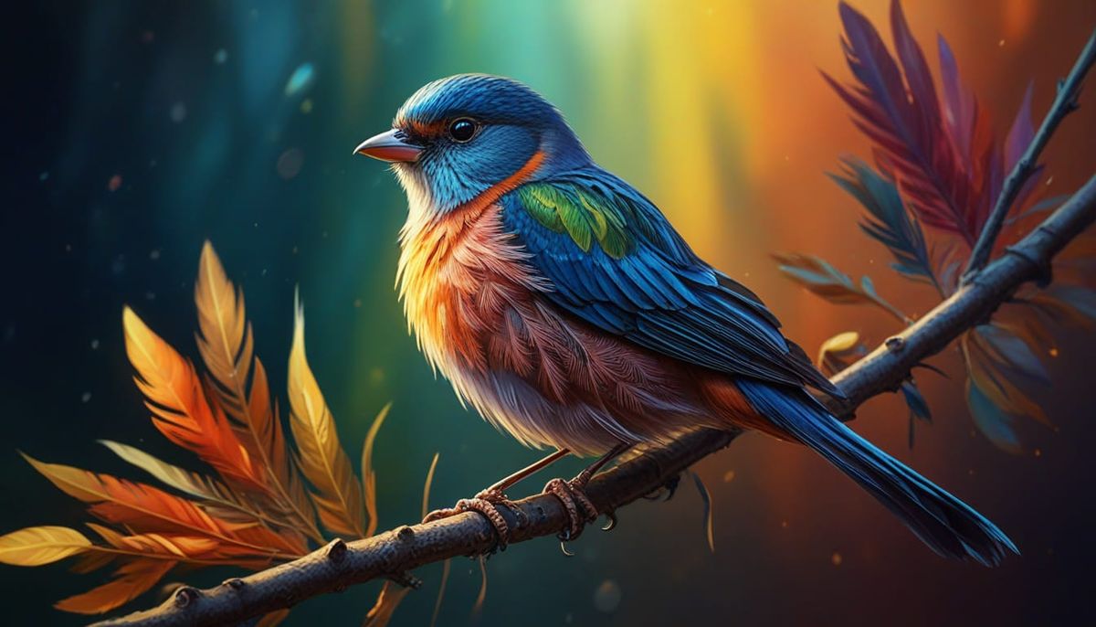 This image shows a small bird perched on a branch, rendered in a vibrant oil painting style with iridescent feathers. Dramatic lighting creates deep shadows against colorful foliage.