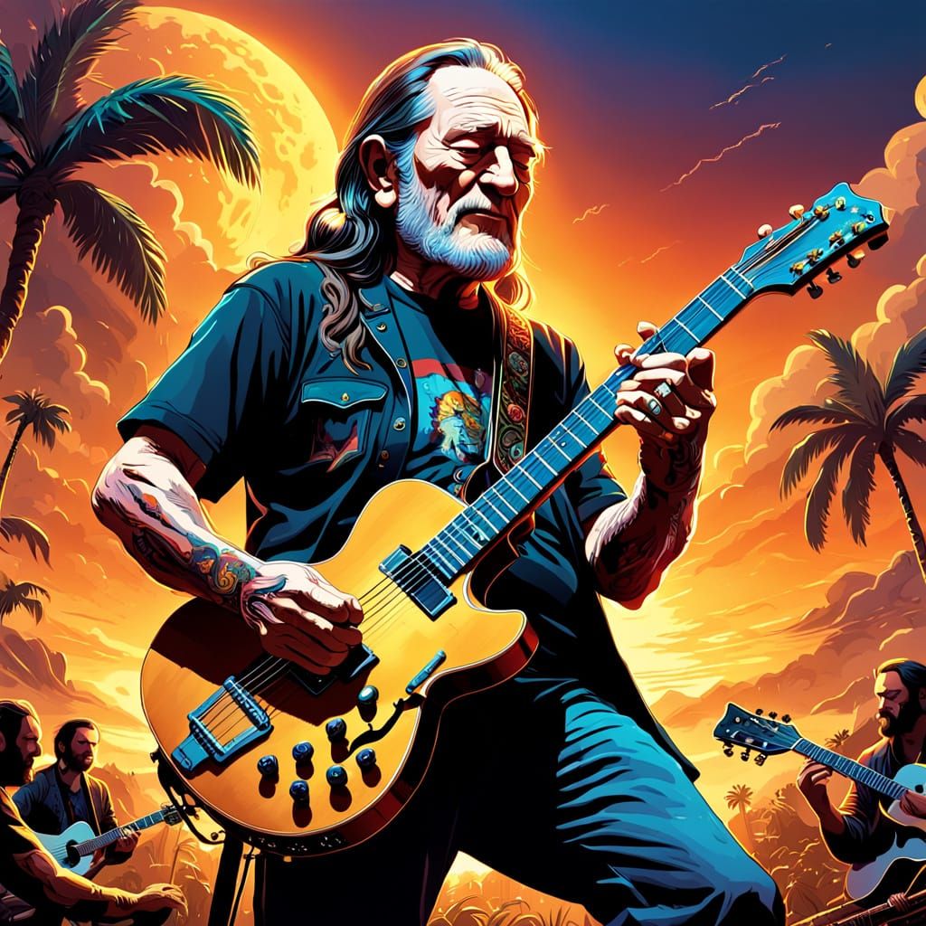 This image shows Willie Nelson in a medium shot playing guitar with vibrant colors and detailed textures. The piece is digital art with a comic book aesthetic.