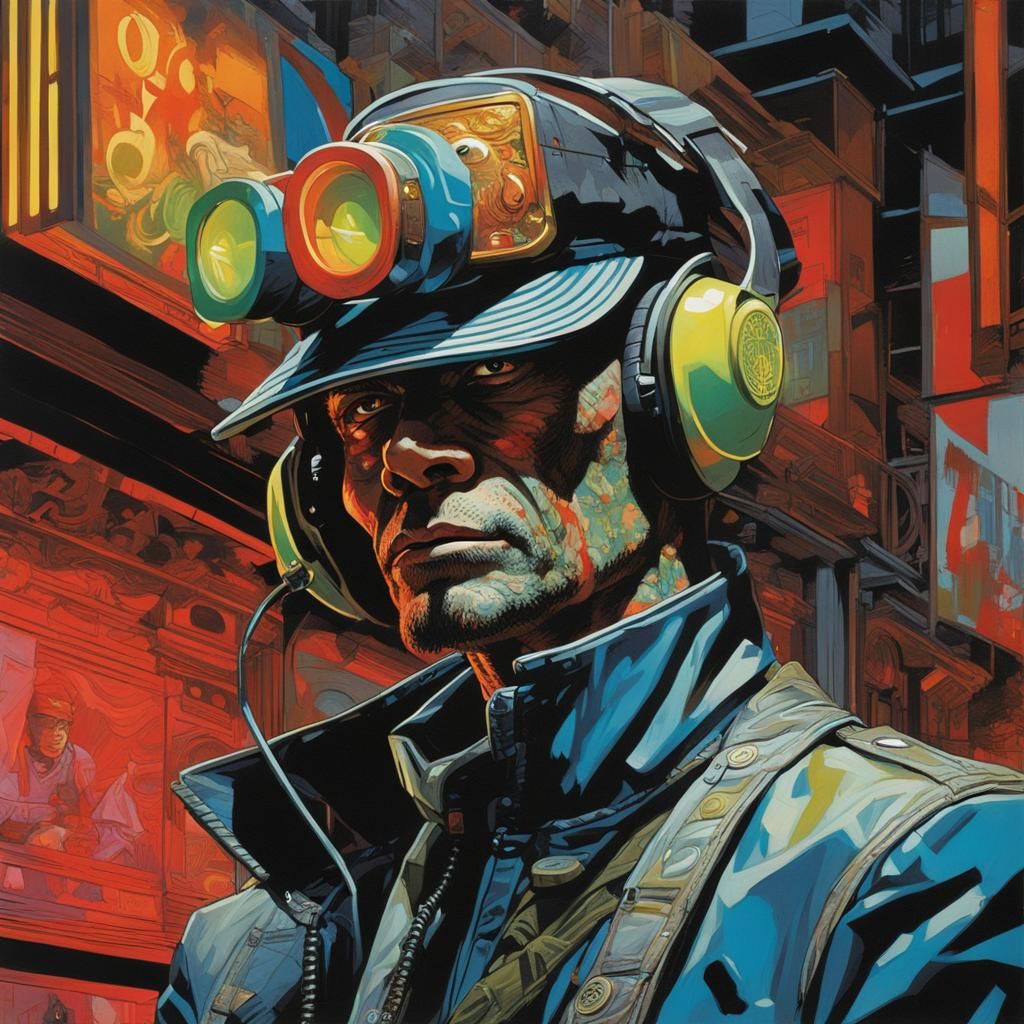 A vivid illustration of a mysterious figure with a highly detailed face, rendered in strong contrasting neon colors. The artwork evokes a mixed aesthetic of comic art and classic illustration.