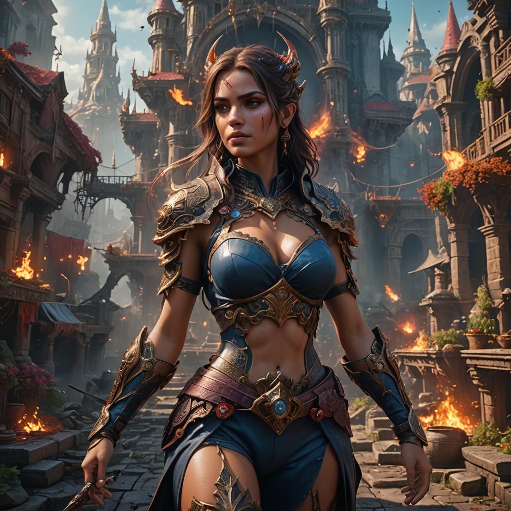 This image shows a beautiful woman in a fantasy concept art style. The artwork features deep colors and intricate details, rendered in 8k resolution.
