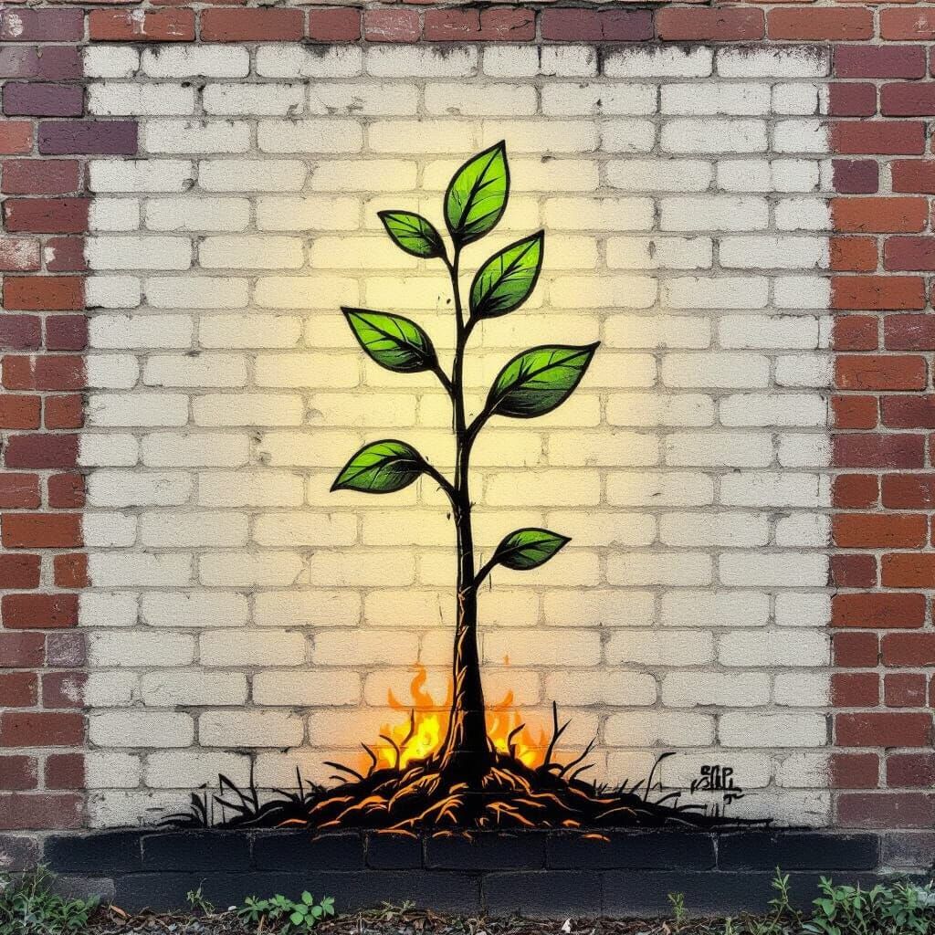 This minimalist line art shows a wilting tree on a brick wall, with a single green leaf emerging, symbolizing environmental hope. Rendered in muted earth tones with subtle glowing embers.