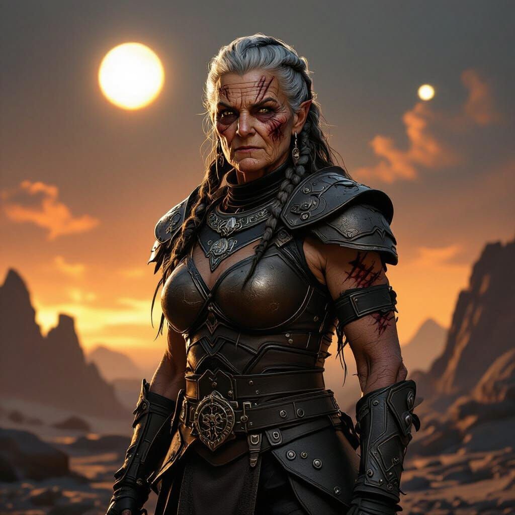 This image shows a powerful, elderly Klingon warrior with weathered skin and ornate armor, standing defiantly on a rocky alien world. Cinematic lighting emphasizes her rugged features and muscular physique, evoking a dark fantasy aesthetic.