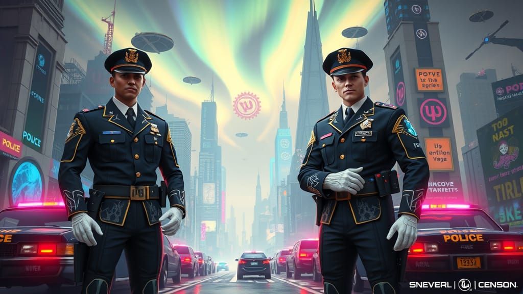 This image depicts a detailed, fantastical law enforcement scene with intricate details and deep colors, blending the boundaries of reality and fantasy.