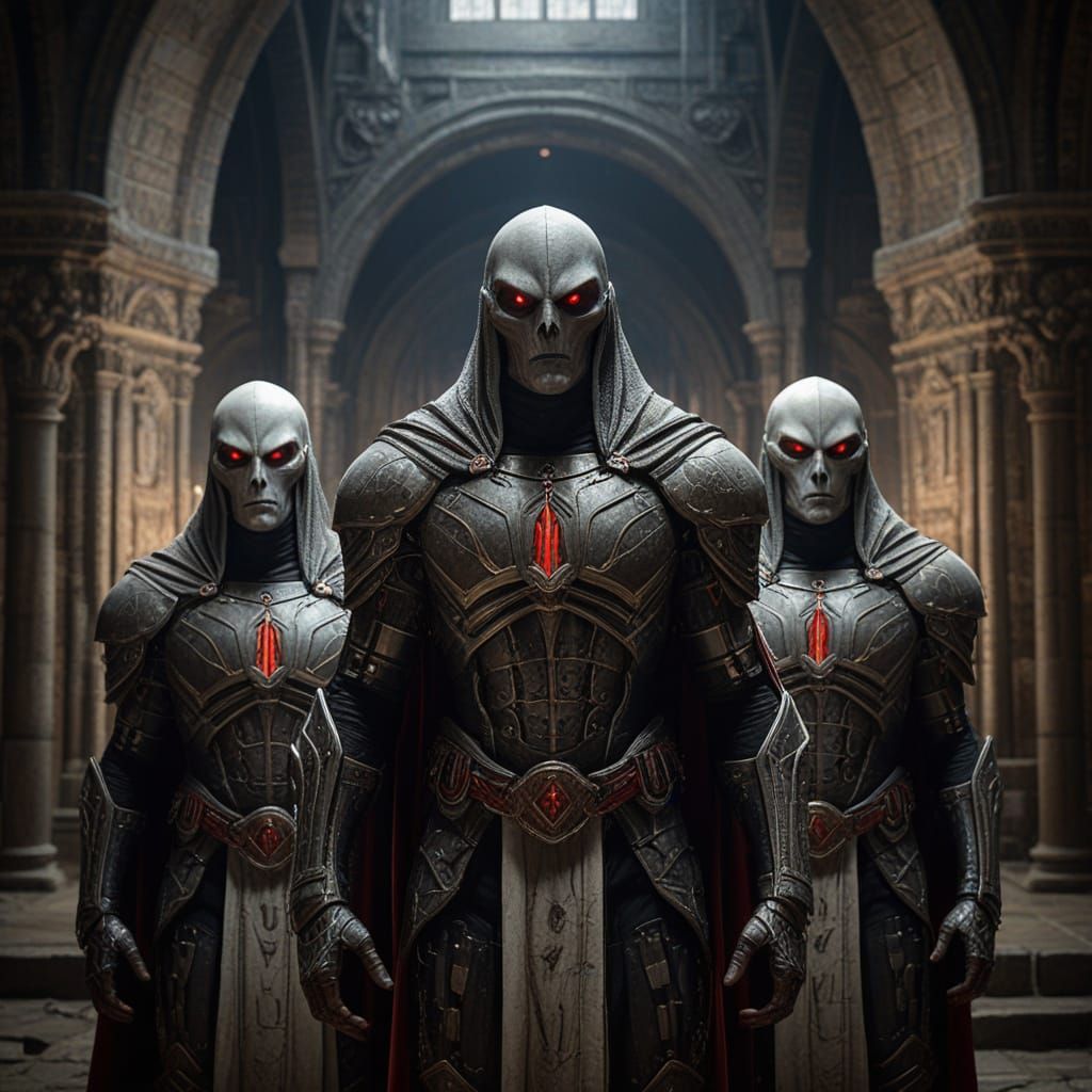 Three alien knights with gray skin, wearing intricately detailed medieval armor with ornate engravings, and flowing white capes with bold red crosses, stand side by side in a dimly lit, ancient cathedral with weathered stone walls and soaring arches, their alien faces fully visible with serious, stern ...