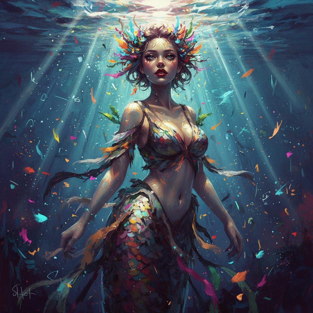 This AI-generated artwork features an anime-style portrait of a beautiful mermaid with masculine facial features, depicted underwater with dynamic lighting and vivid triadic colors. The image showcases detailed shading and a painterly texture.
