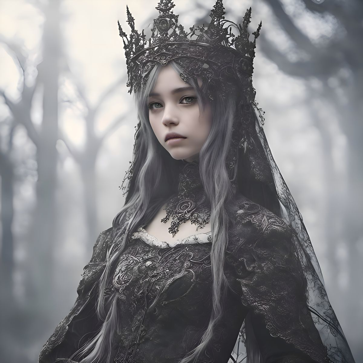 A haunting image of a young anime princess in a gothic setting, surrounded by fog. The portrait features intricate details, dramatic lighting, and a dark fantasy aesthetic with purple and yellow hues.