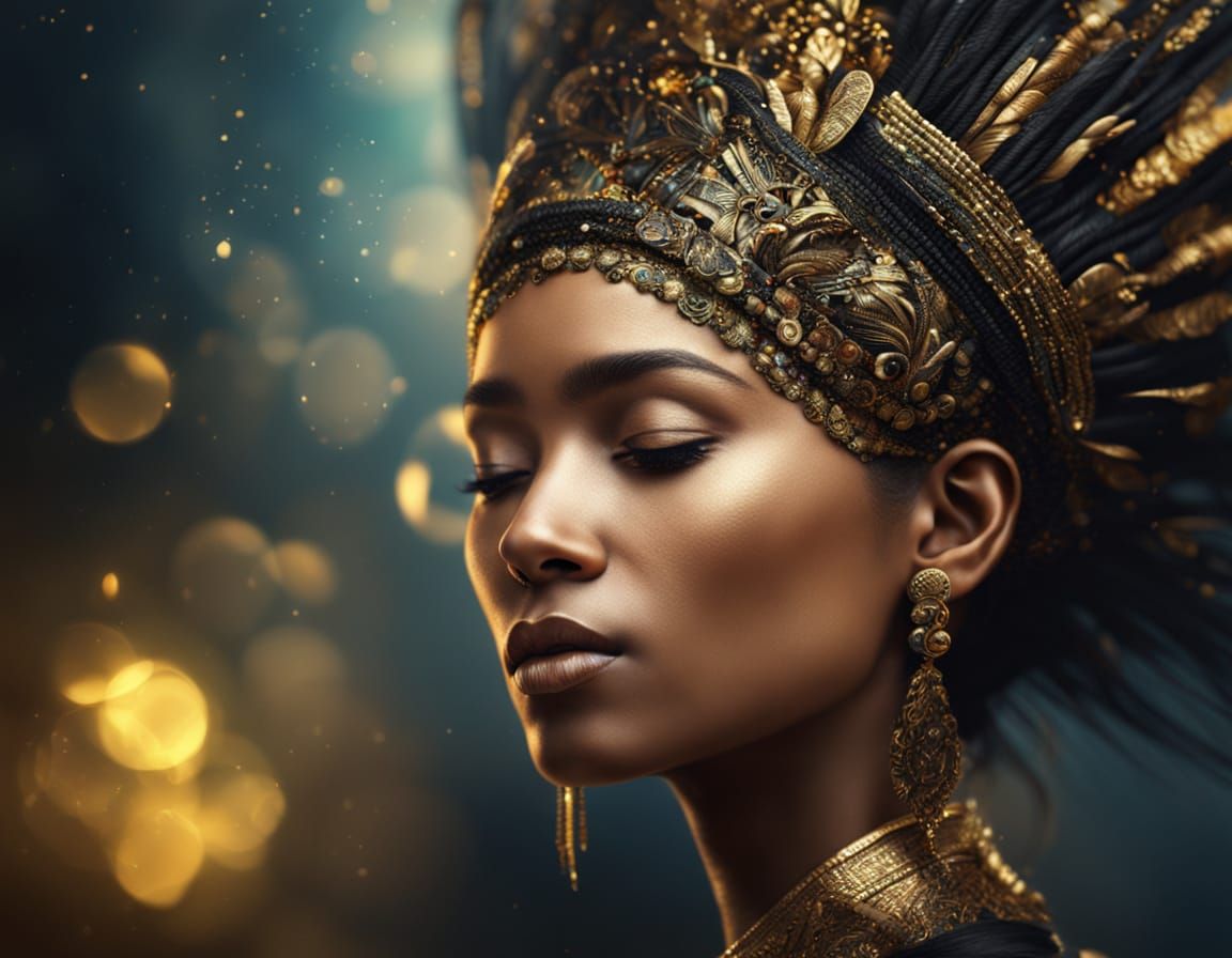 This image shows a close-up digital portrait of a woman wearing an elaborate black and gold headdress. The soft focus, golden lighting, and bokeh create a luxurious, refined aesthetic.