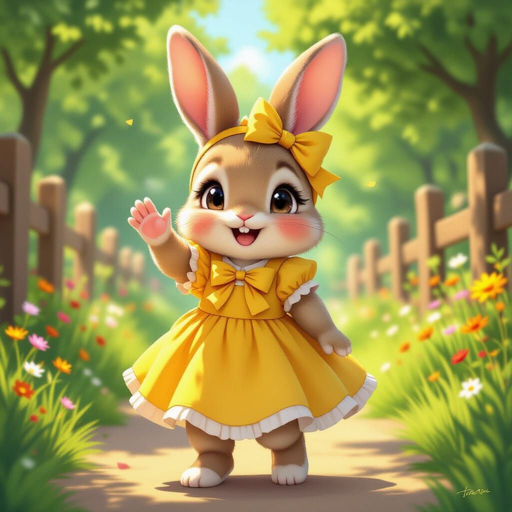 This image shows a cute bunny in a yellow sundress waving. It features a hyper-realistic anime style, with intricate textures and lighting, and vibrant colors.