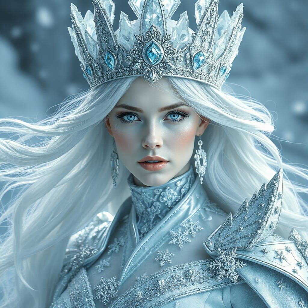 This image depicts a stunning ice queen with flowing white hair and icy blue eyes. She wears a crystalline crown and gown of frost, set in a majestic winter landscape, rendered with ultra-detailed fantasy realism.