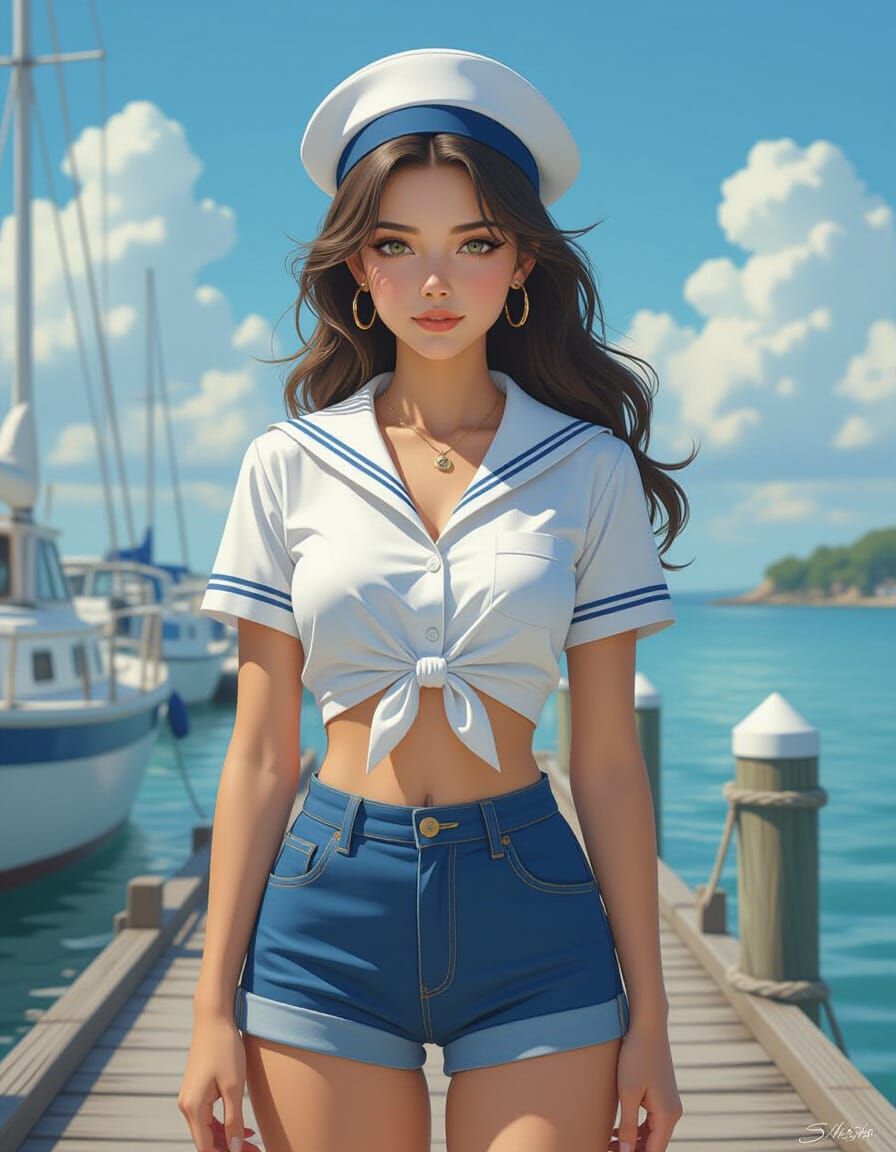 A photorealistic image of an elf woman in a sailor outfit with blue shorts, standing on a dock. Features detailed textures and vibrant colors.