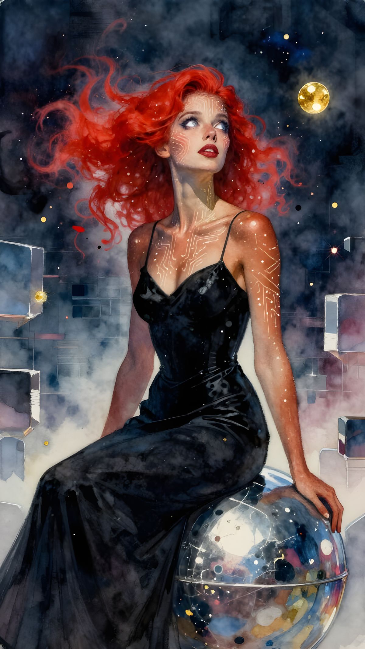 This watercolor painting depicts a woman with glowing eyes and red hair dissolving into a starry mist, sitting on a chrome orb with cosmic energy. Neon lighting highlights her detailed skin.