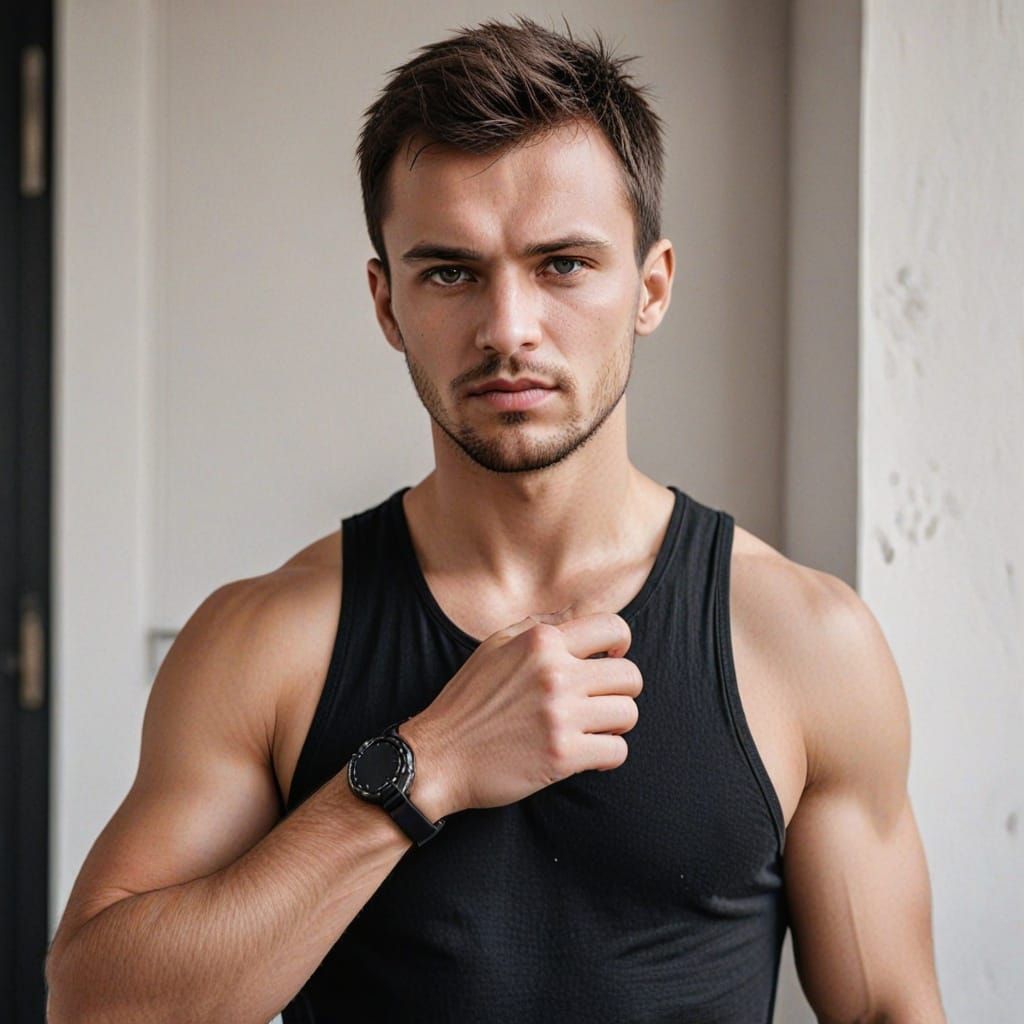 A striking portrait of a Slavic man in a black tank top, confidently gazing into the camera. The image features a shallow depth of field and bokeh, resembling high-end DSLR fashion photography.