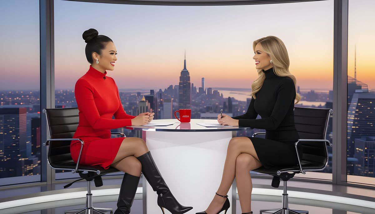 This image shows a mixed-race TV weather forecaster in a red leather dress, sitting at a desk in a modern studio. Her blonde co-anchor is beside her, with a city skyline and sunset visible.