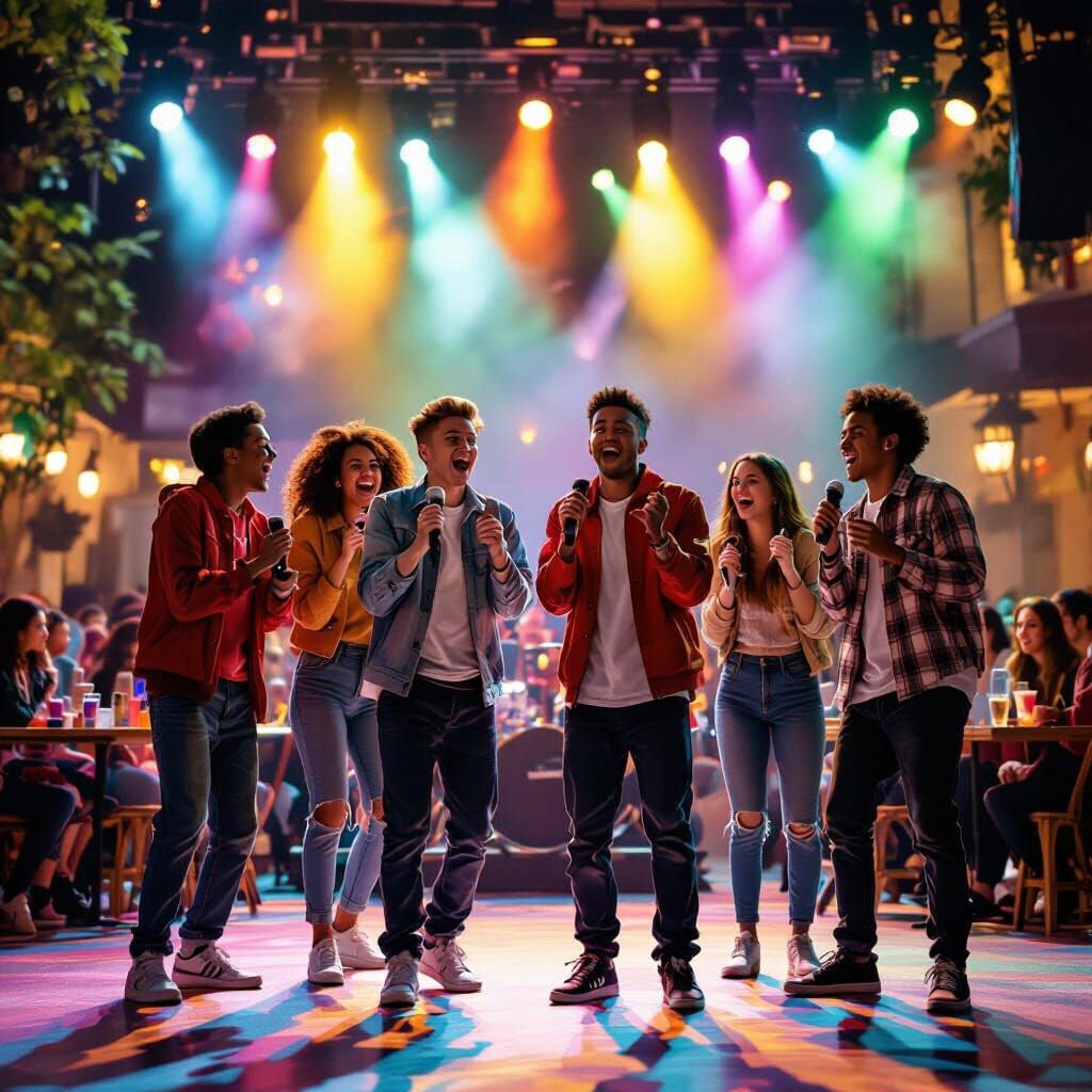 This image shows diverse teenagers singing karaoke on a brightly lit stage. The scene, reminiscent of a film still, captures the energy of the performance with cinematic lighting and a warm, grainy texture.