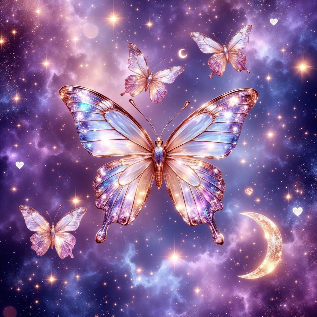 This image features a vertical phone screen wallpaper with a dreamy maximalist collage aesthetic. It showcases swirling galaxy colors, chrome butterflies, holographic stars, and glowing crescent moons in a digital art style.