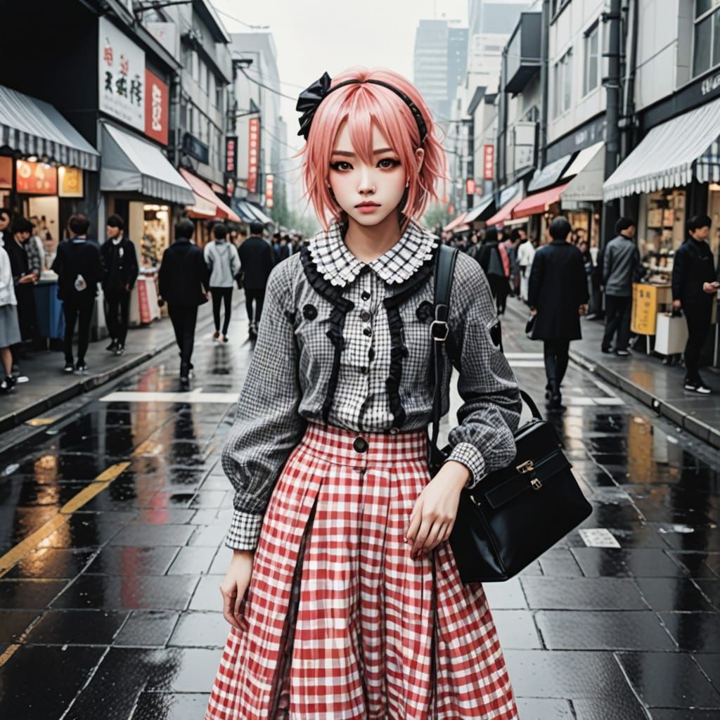 This image showcases a vibrant gingham pattern in a striking visual kei fashion illustration. The artwork blends traditional textiles with bold, eclectic style.