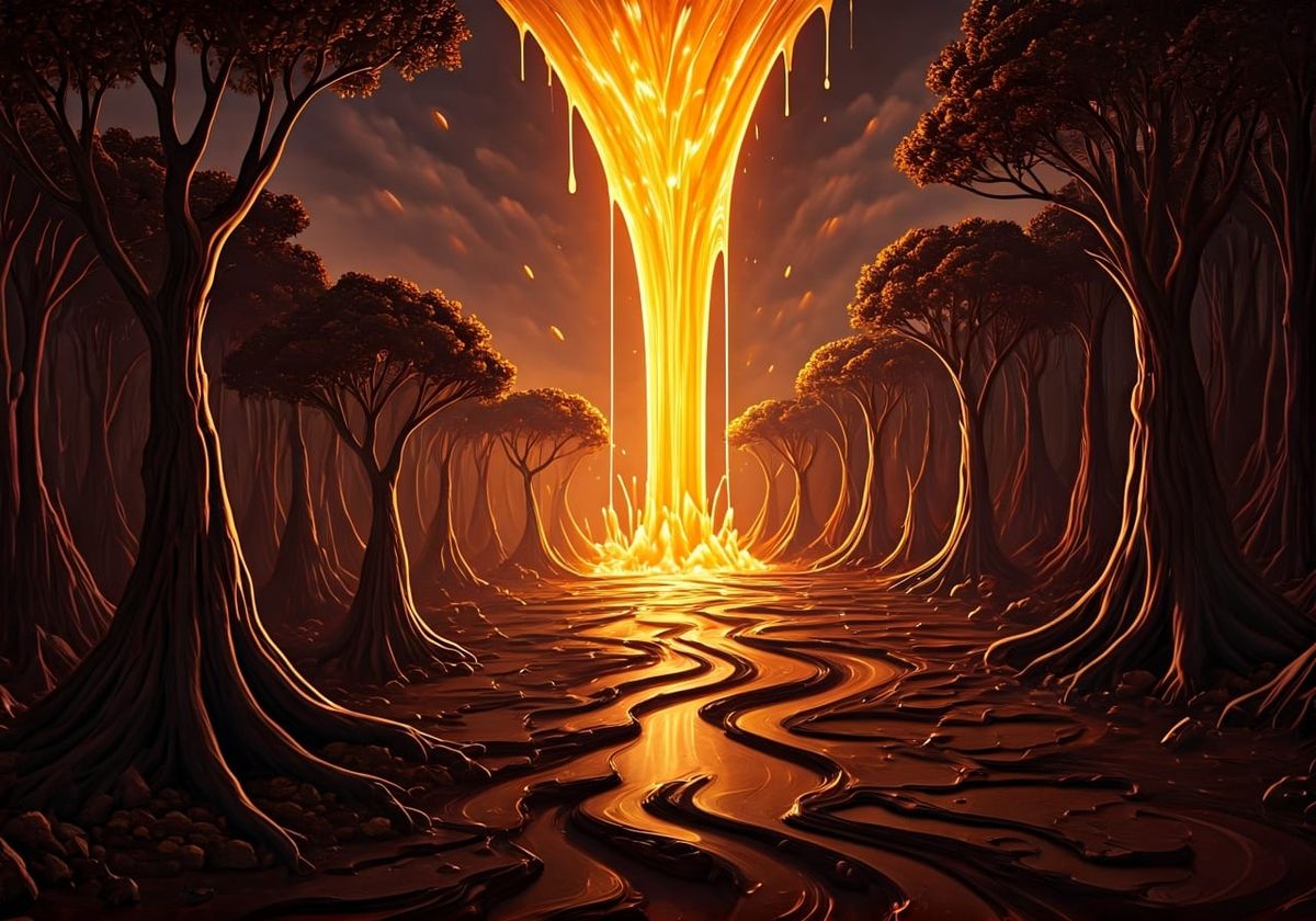 This image shows a volcano erupting molten chocolate that flows through a valley. The surrounding landscape is transformed into a delicious confectionery world with trees coated in chocolate and caramelized sugar crystals.