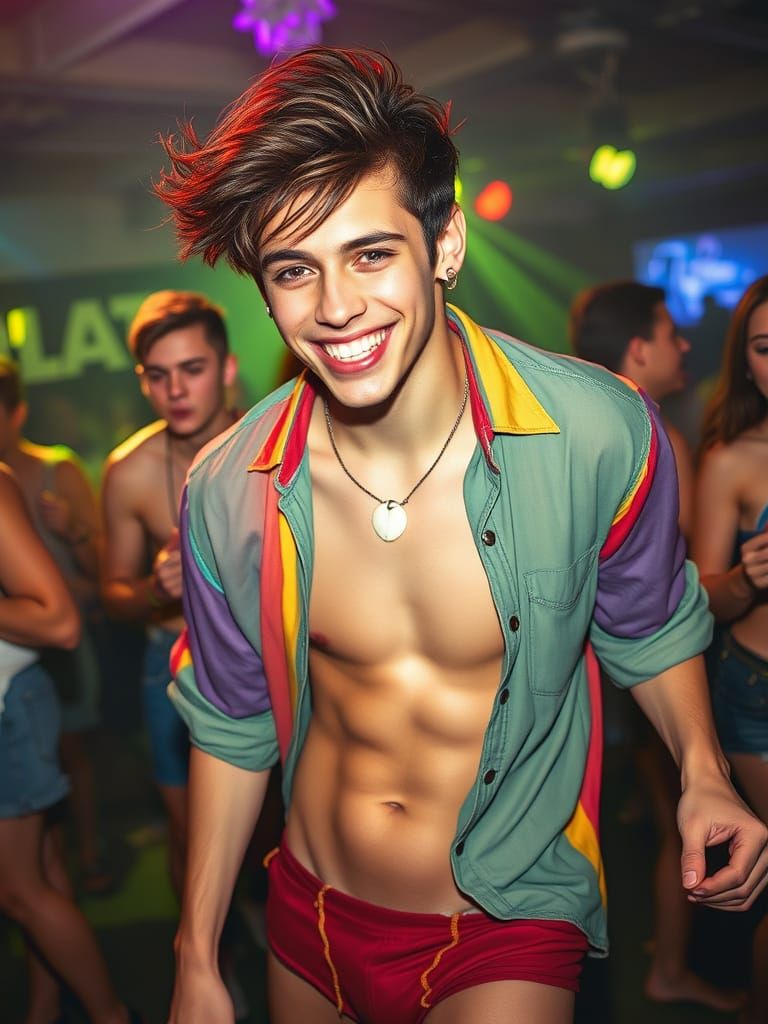 A captivating image of a young man dancing with abandon at a vibrant party, showcasing his carefree spirit and self-expression through a kaleidoscope of colors and dynamic movement.