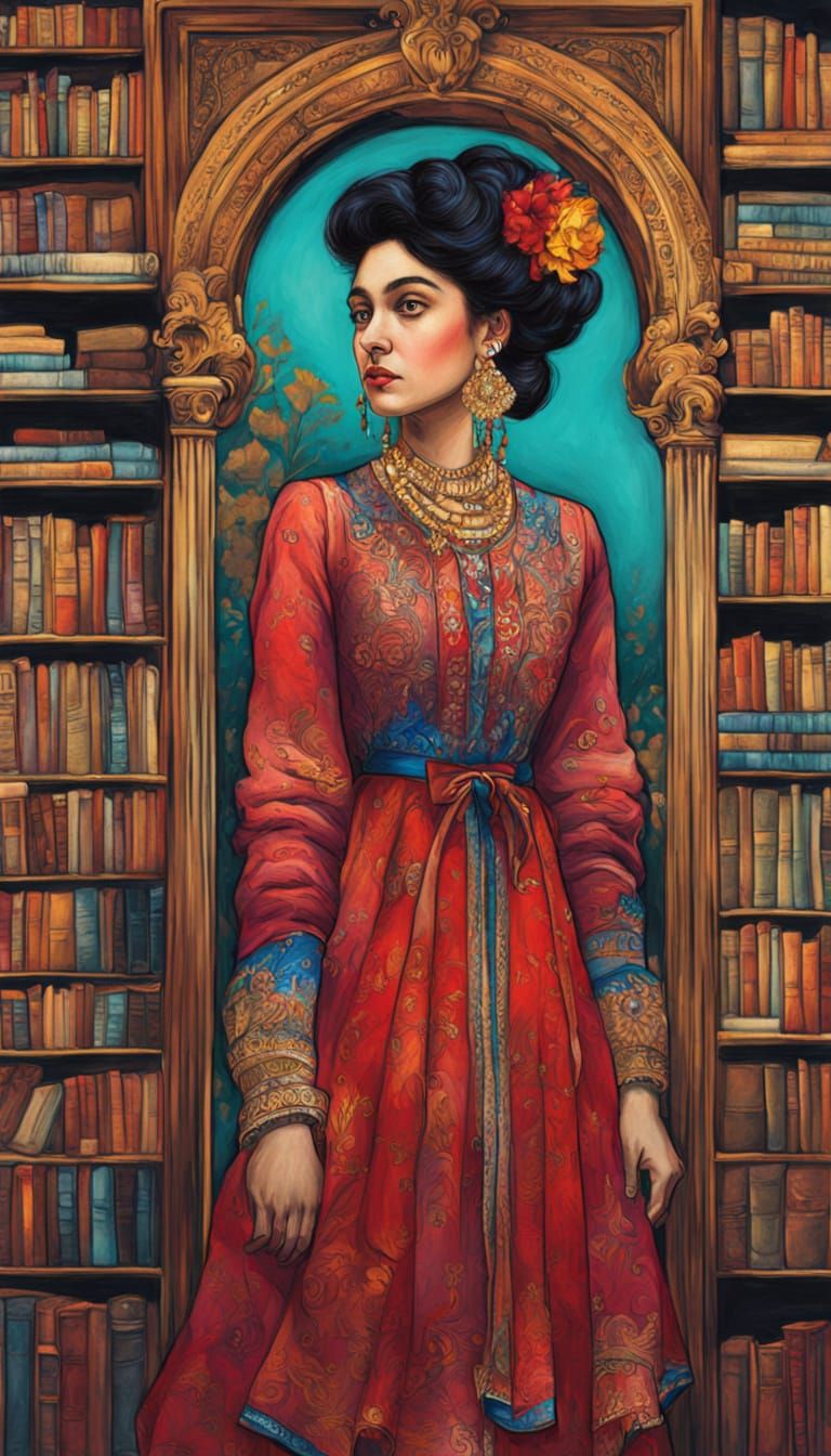 A vibrant oil painting of a Victorian woman with soft features and gold hoop earrings, standing in a library. The artwork blends street art textures with Persian elegance using bold, high-contrast colors.