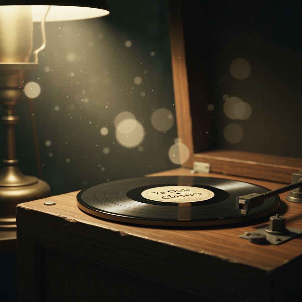 This image shows a vintage vinyl record on a wooden turntable, bathed in warm, soft light. It evokes nostalgia and melancholy with a dreamy, diffused background and cinematic lighting.